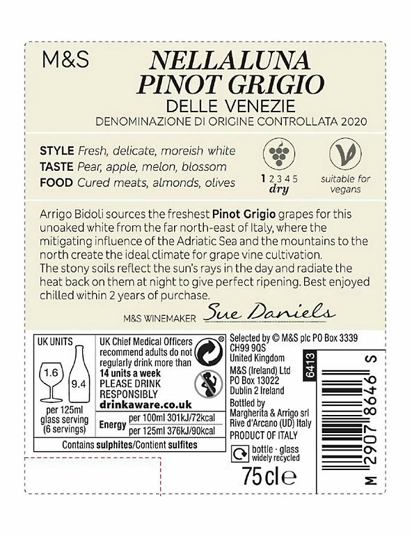 Arrigo Bidoli sources the freshest Pinot Grigio grapes for this unoaked white from the far north-east of Italy, where the mitigating influence of the Adriatic Sea and the mountains to the north create the ideal climate of grape vine cultivation. The stony soils reflect the sunβs rays in the day and radiate the heat back on them at night to give ideal ripening. Best enjoyed chilled within 1 year of purchase.
