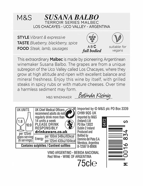 This extraordinary Malbec is made by pioneering Argentinian winemaker Susana Balbo. The grapes are from a unique subregion of Uco Valley calles Los Chacayes, where they grown at high altitude and ripen with excellent balance and mineral freshness. Enjoy this wine by itself, with grilled steaks in spicy rubs or with mature cheeses. Over time a harmless sediment may form.