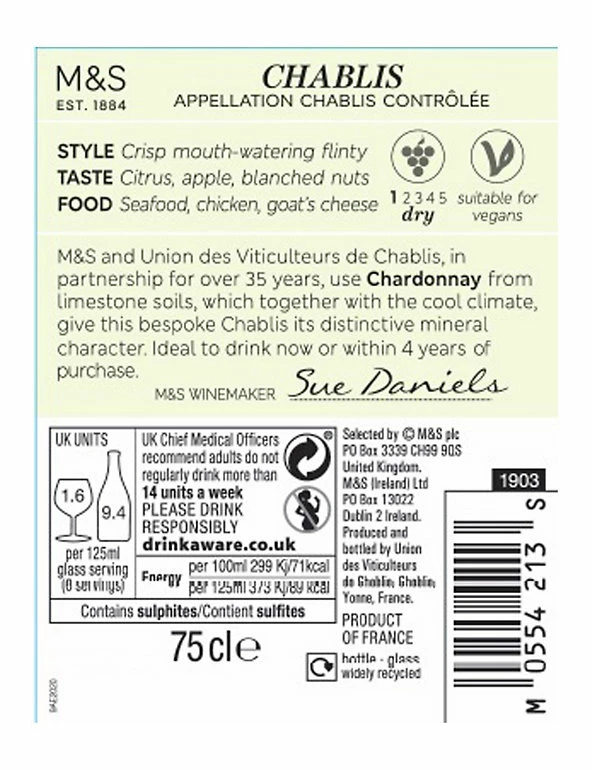 M&S and Union des Viticulteurs de Chablis in partnership for over 25 years, use Chardonnay from limestone soils, which together with the cool climate, give this bespoke Chablis its distinctive mineral character. Ideal to drink now or within 2 years.