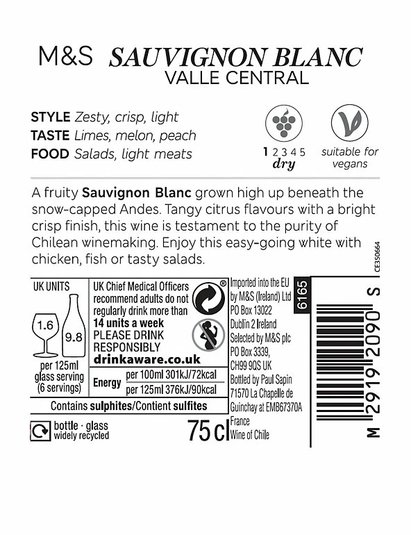 A fruity Sauvignon Blanc grown high up beneath the snow-capped Andes. Tangy citrus flavours with a bright crisp finish, this wine is testament to the purity of Chilean winemaking. Enjoy this easy-going white with chicken, fish or tasty salads.