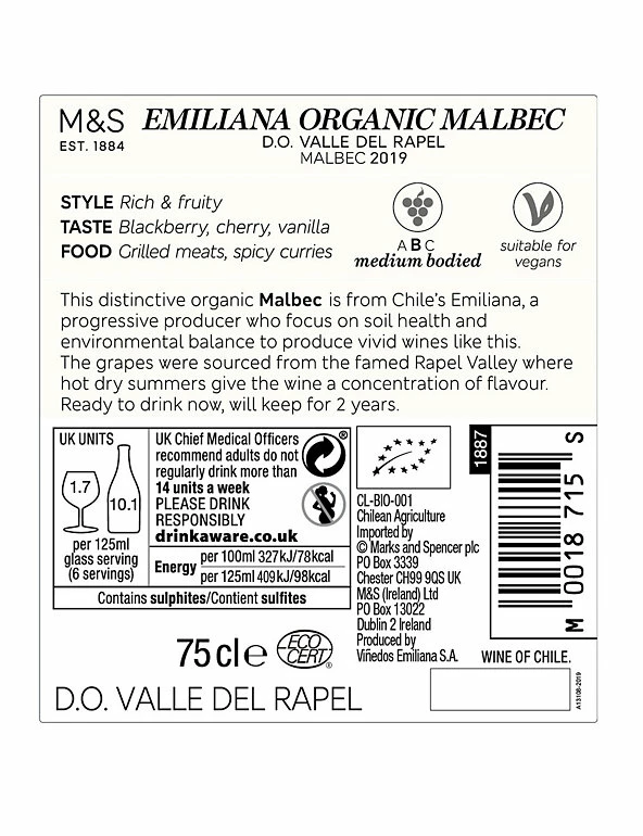 This distinctive organic Malbec is from Chileβs Emiliana, a progressive producer who focus on soil health and environmental balance to produce vivid wines like this. The grapes were sourced from the famed Rapel Valley where hot dry summers give the wine a concentration of flavour. Ready to drink now, will keep for 2 years.